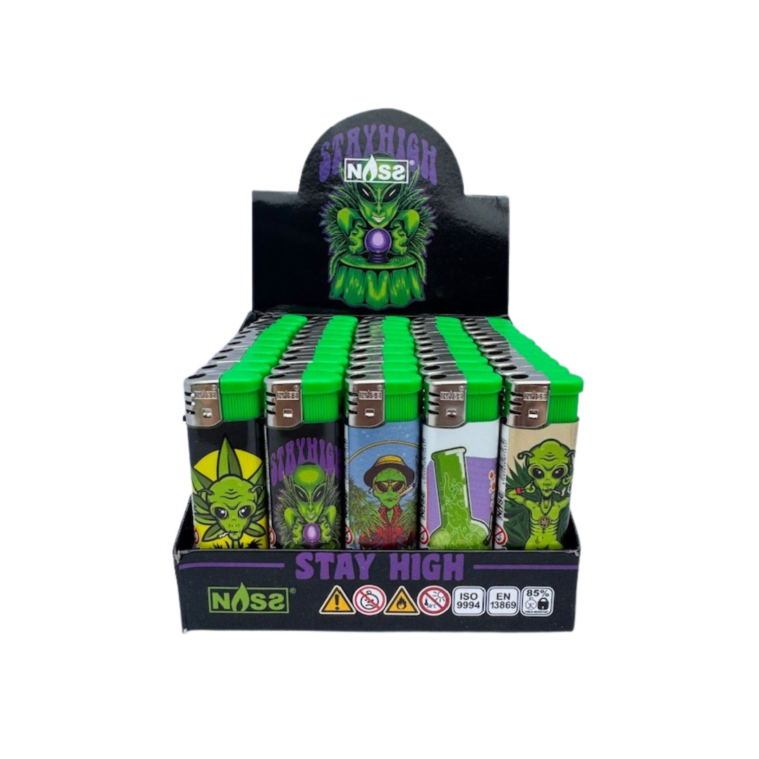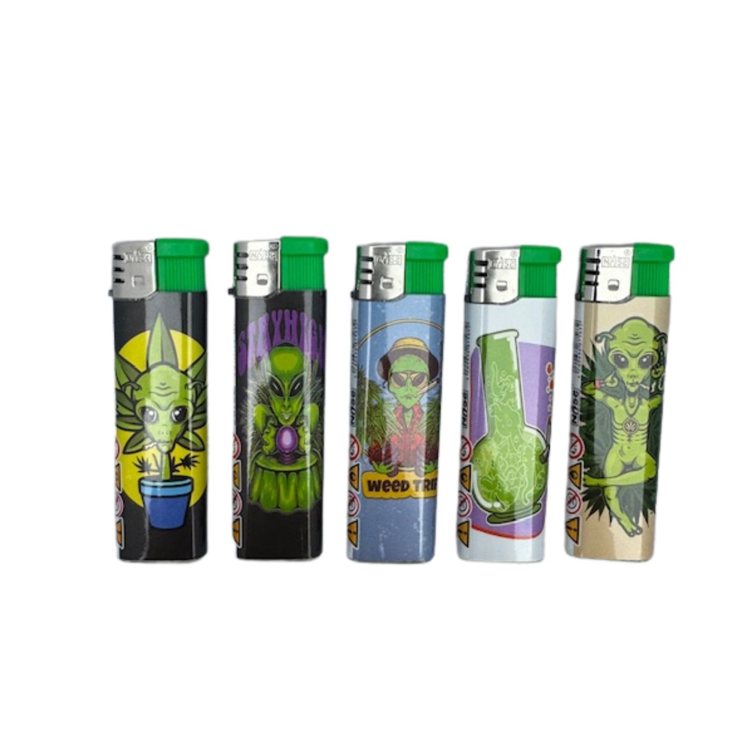 Super cool Alien lighters in different designs, but of course with weed leaf, hence the title Stay High!