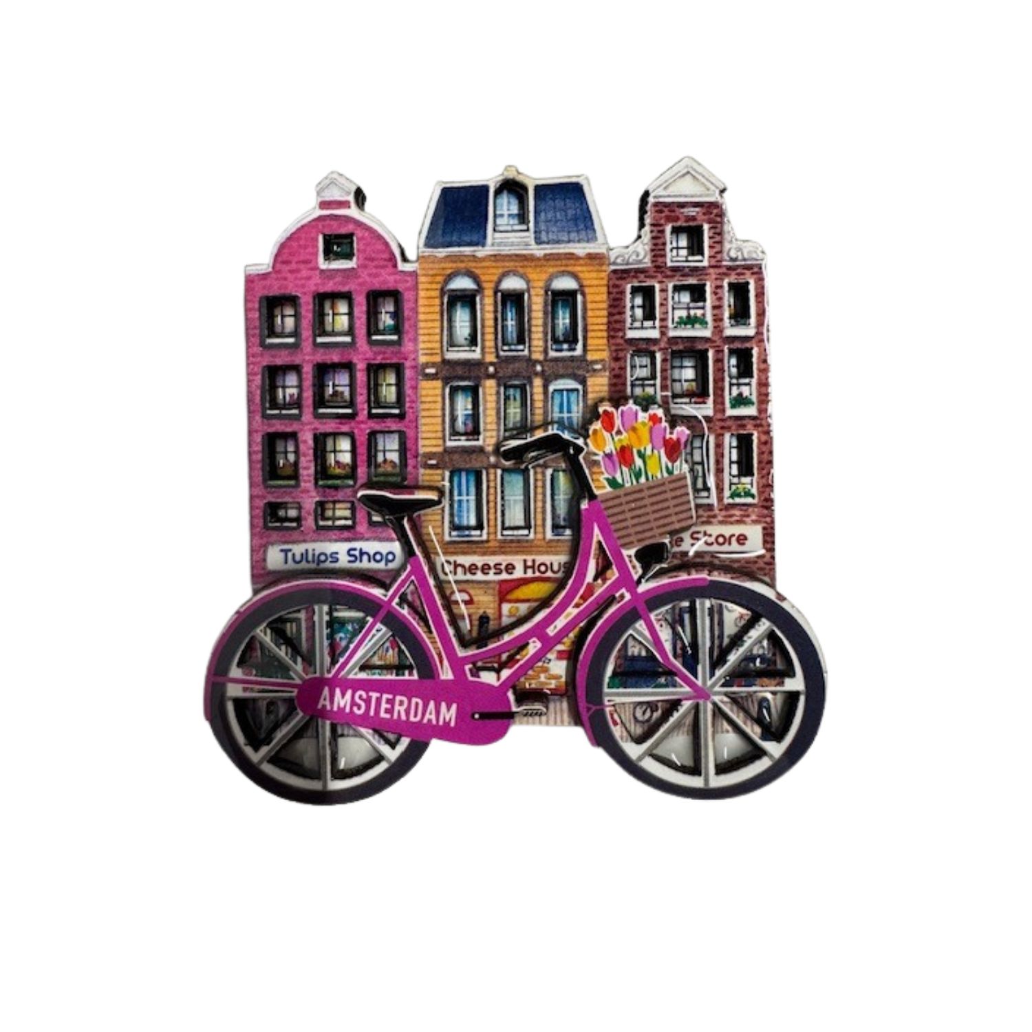 A stunning magnet featuring a traditional Dutch bicycle with the famous Canal Houses behind it.