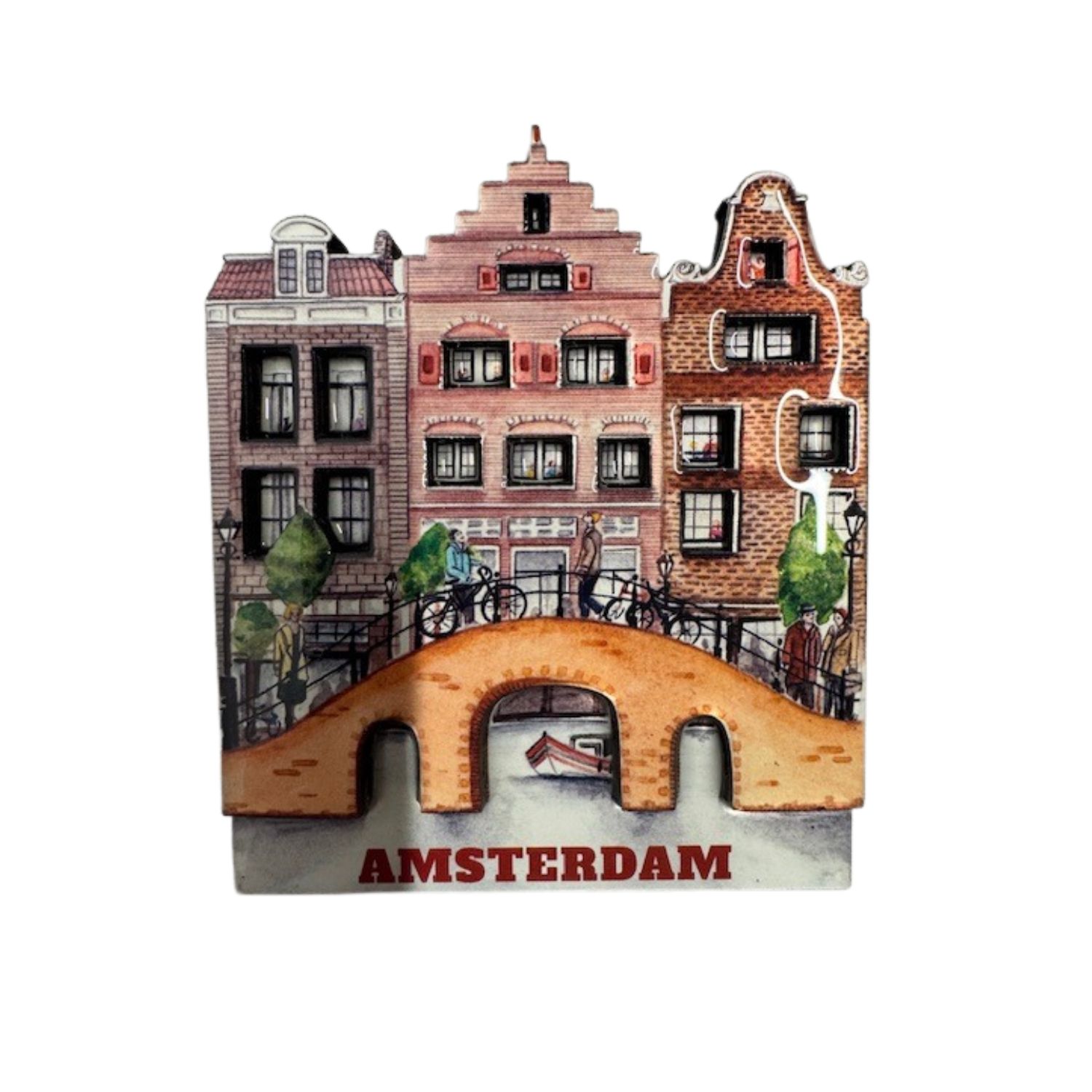 Beautiful magnet featuring a typical image of an Amsterdam bridge with canal houses.