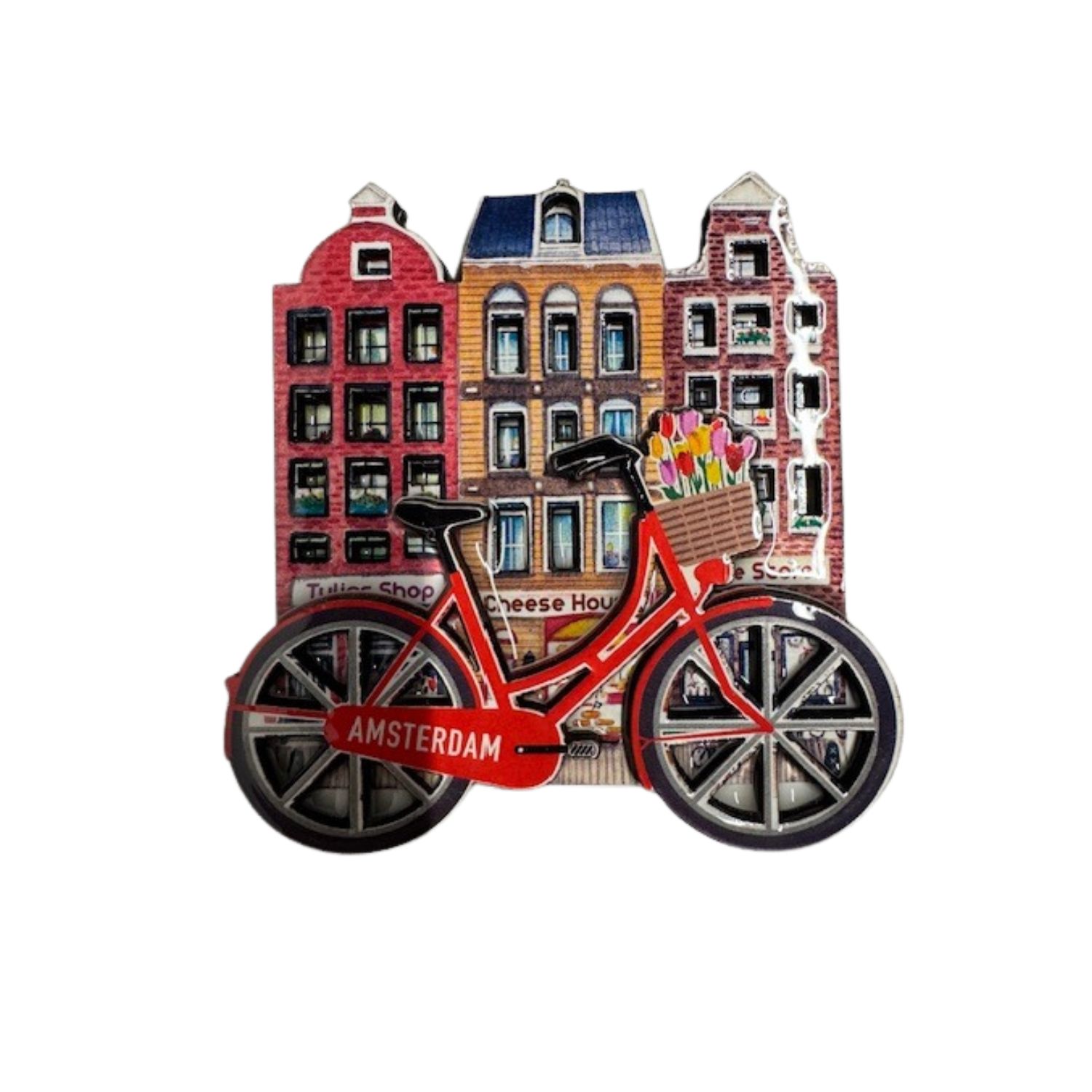 A stunning magnet featuring a traditional Dutch bicycle with the famous Canal Houses behind it.